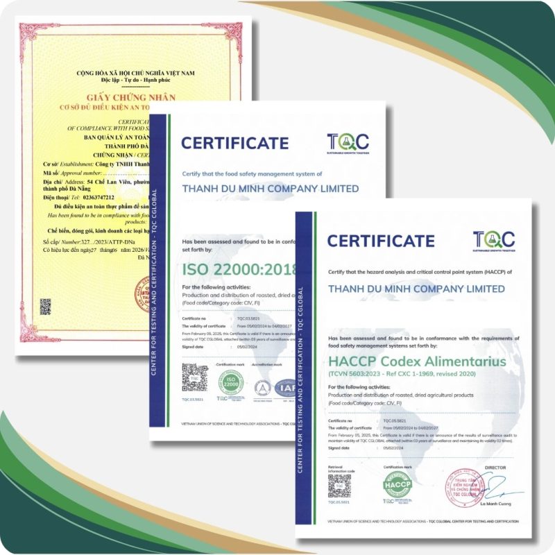 Founded in 2018 in Da Nang, Thanh Du Minh Co., Ltd. specializes in the production and export of natural agricultural foods. Guided by the vision “Clean Products – Green Living”, we have developed core product lines including dried fruits, herbal teas, nuts, coffee, and other natural specialties.