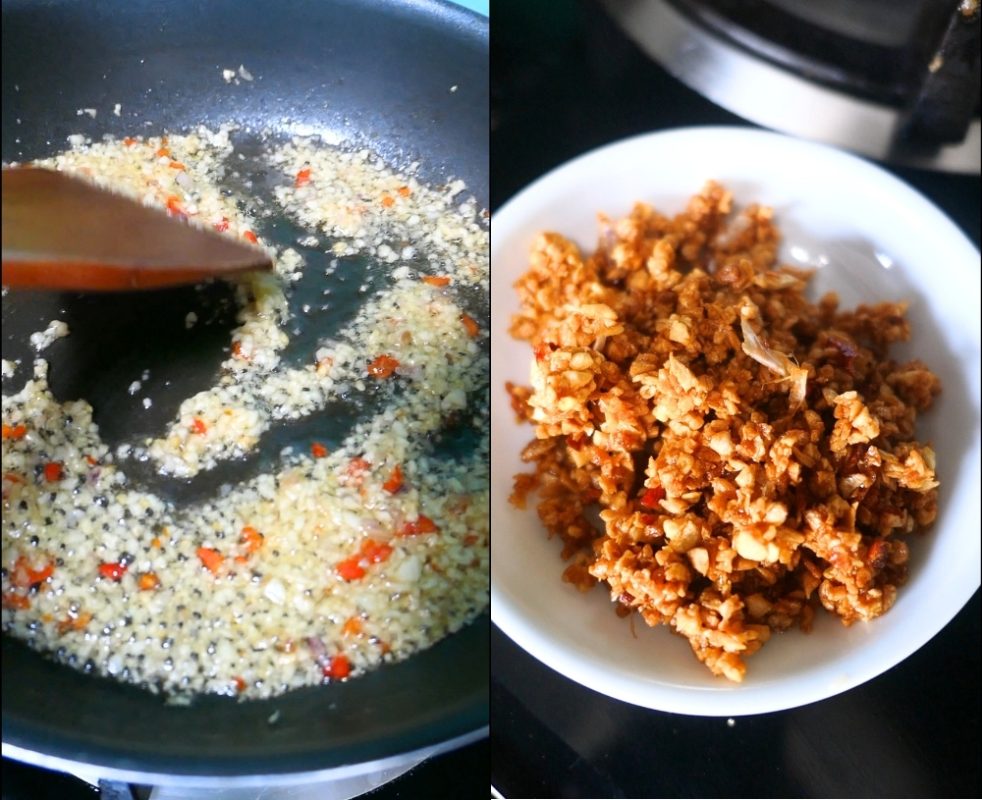 • Step 1: Heat a pan, add cooking oil, and sauté the minced garlic, chili, and shallots until fragrant. Remove them and set aside to drain excess oil.