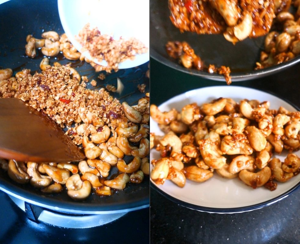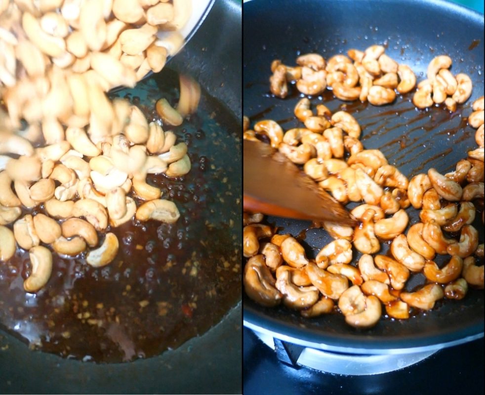 • Step 3: Add the BUBU Premium Cashews Nuts to the pan and stir constantly to ensure the nuts are fully coated in the sauce.