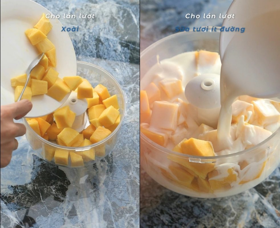 • Step 1: Place the fresh mango, yogurt, and fresh milk into a blender and blend until completely smooth.