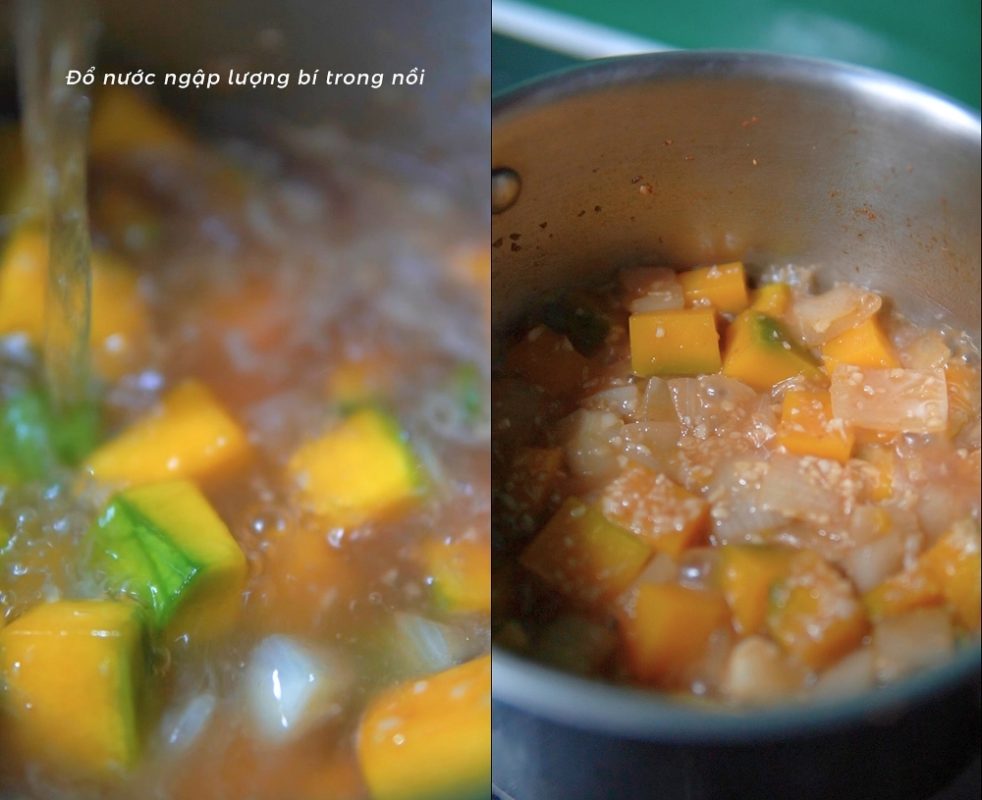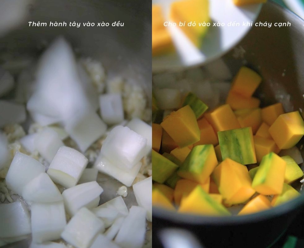 • Step 1: Heat oil in a pot, sauté garlic until fragrant, then add onion and pumpkin. Stir-fry until slightly caramelized.
