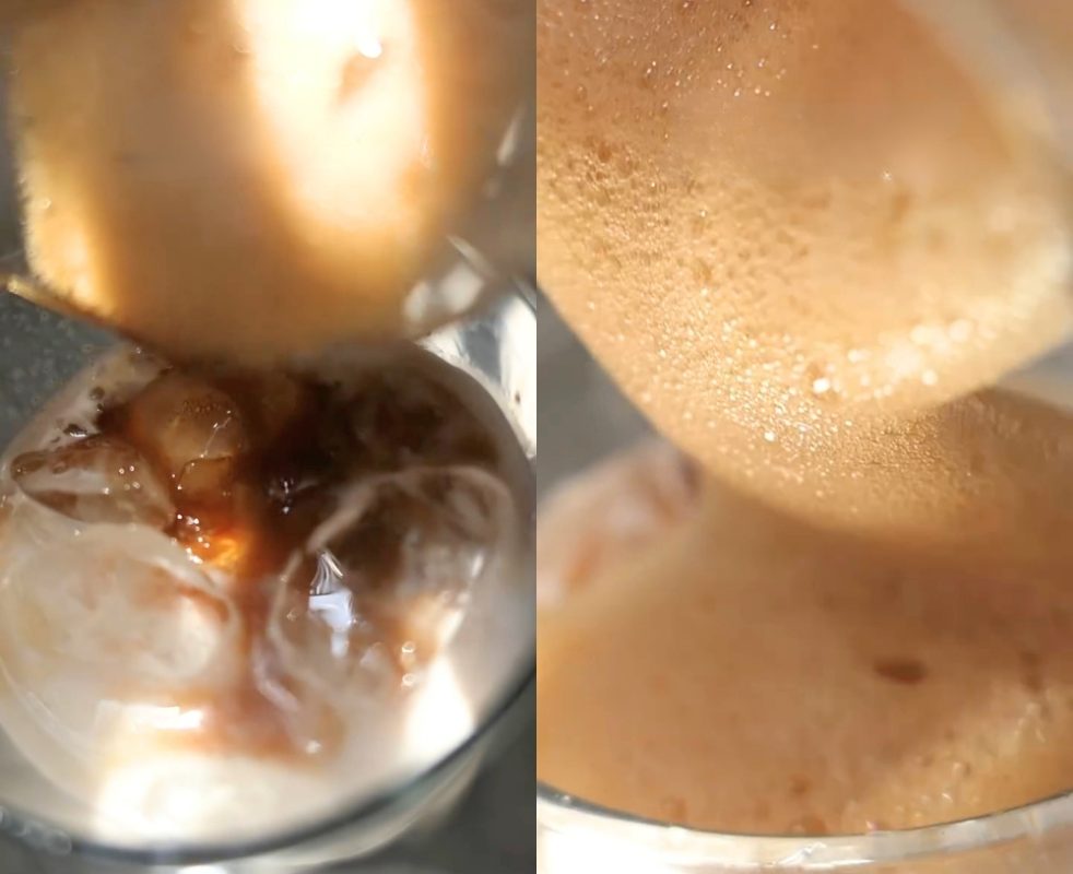 • Step 4: Add ice to the glass with the milk mixture, then gently pour the coffee foam on top.