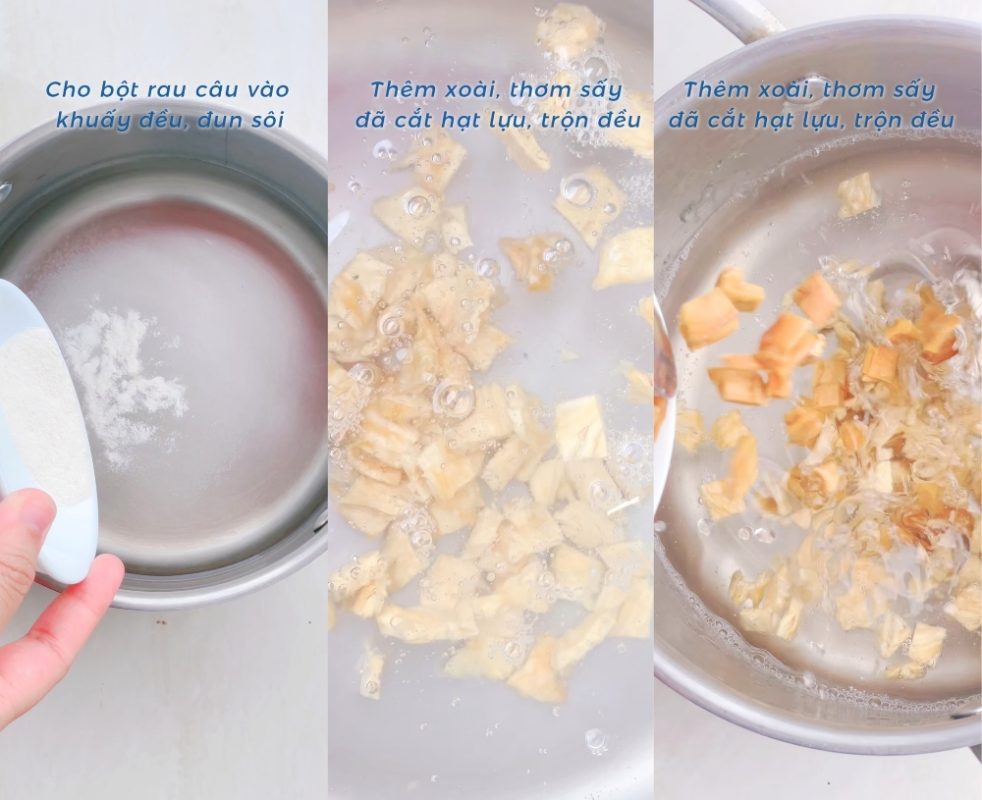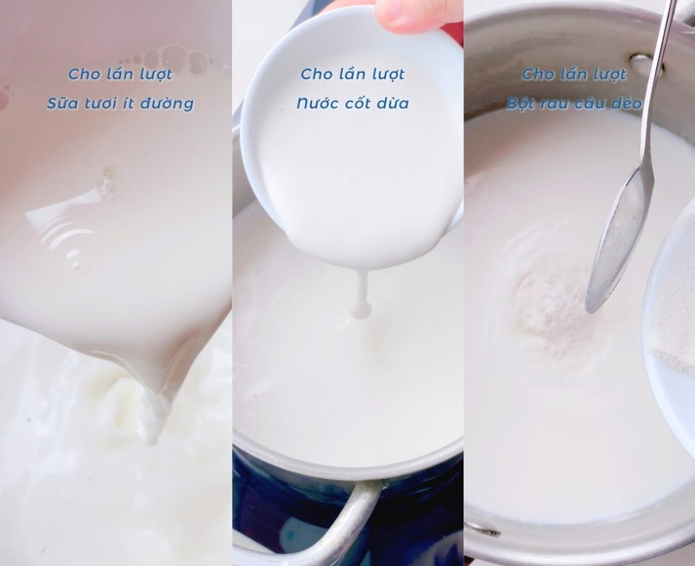 • Step 1: Bring 200ml water to a boil. Add milk, coconut milk, and half the jelly powder. Stir well and bring to a second boil.