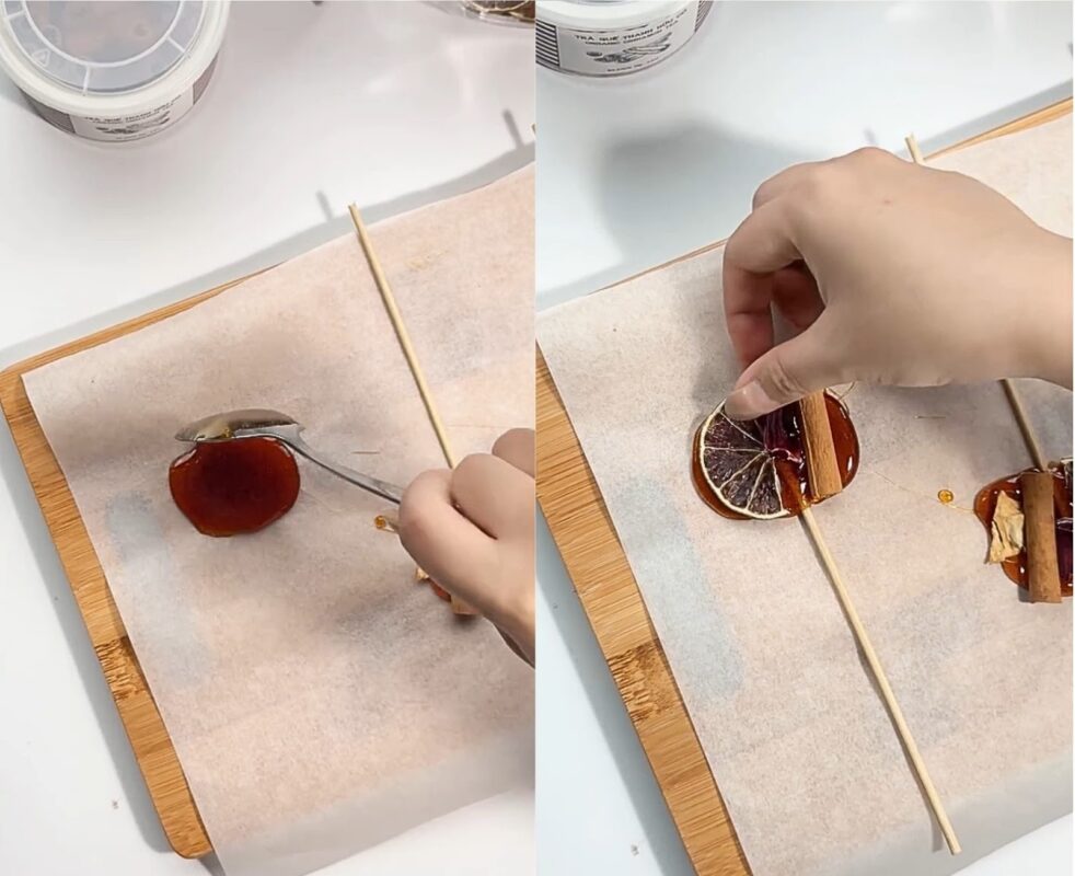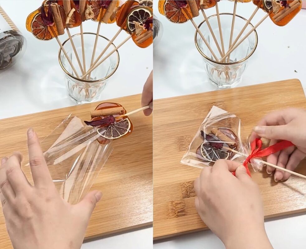 • Step 2: Pour the hot caramel onto parchment paper, forming small round discs. While the caramel is still soft, quickly place a slice of dried lemon, a piece of cinnamon, and a pinch of hibiscus petals on top. Insert a wooden stick into each disc for easy stirring.