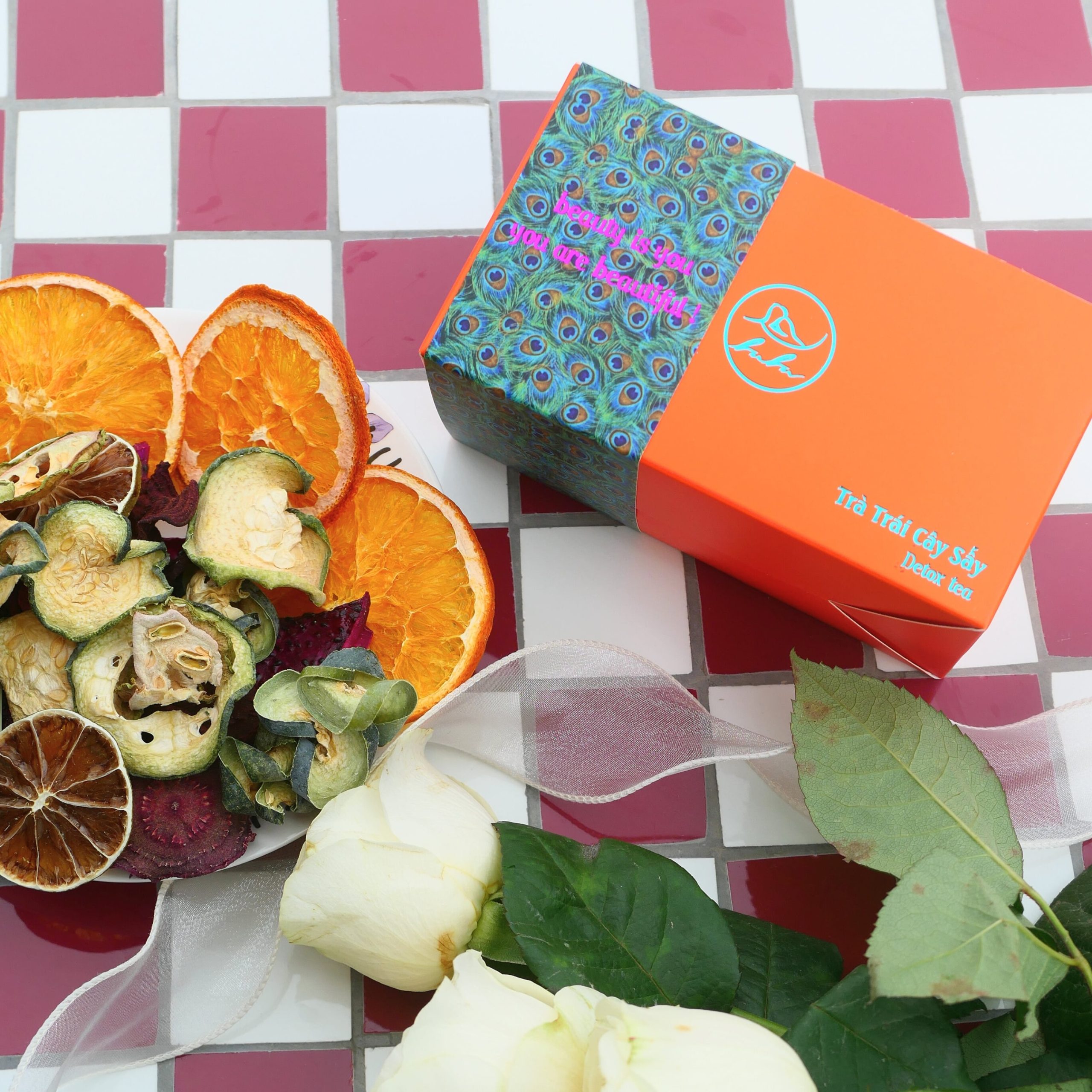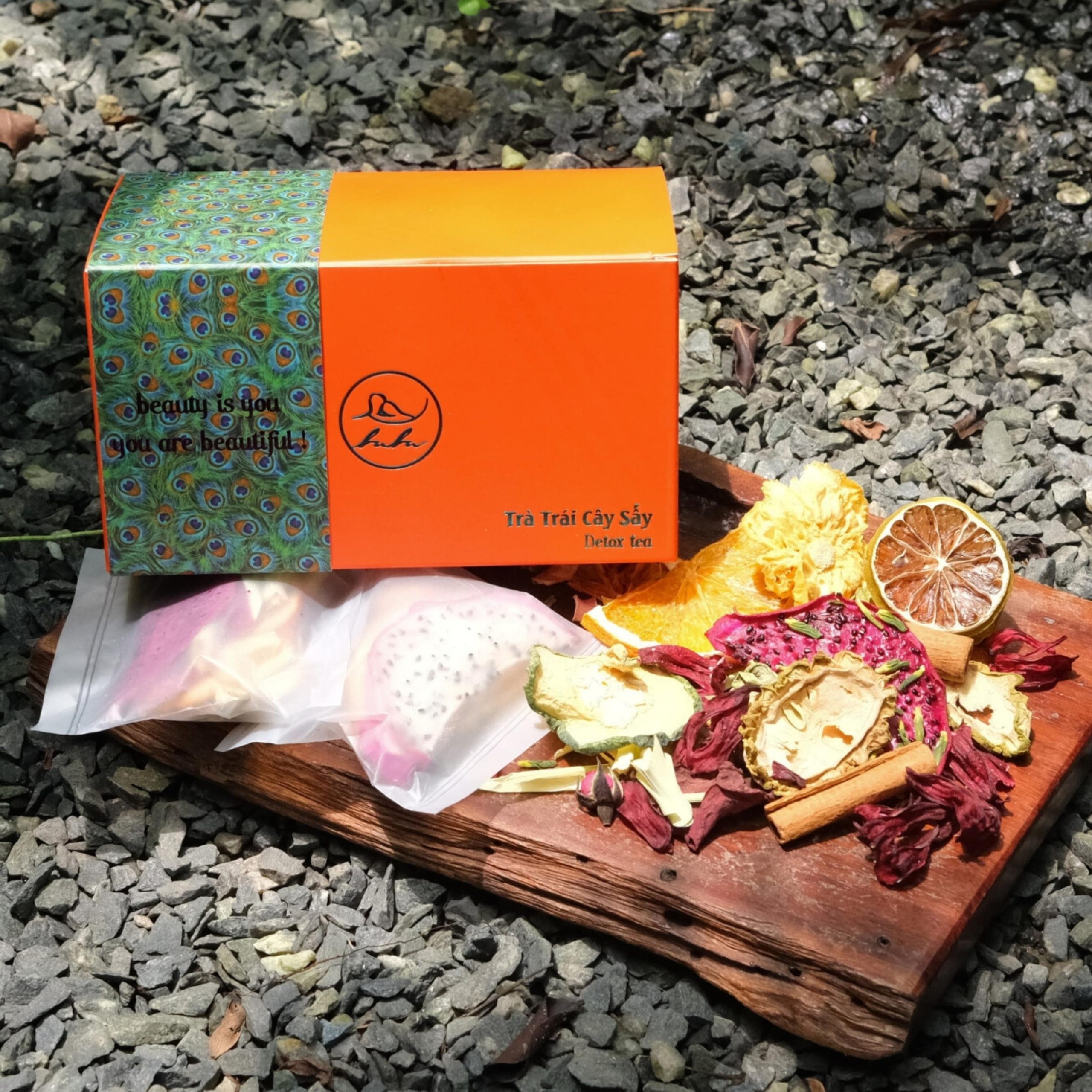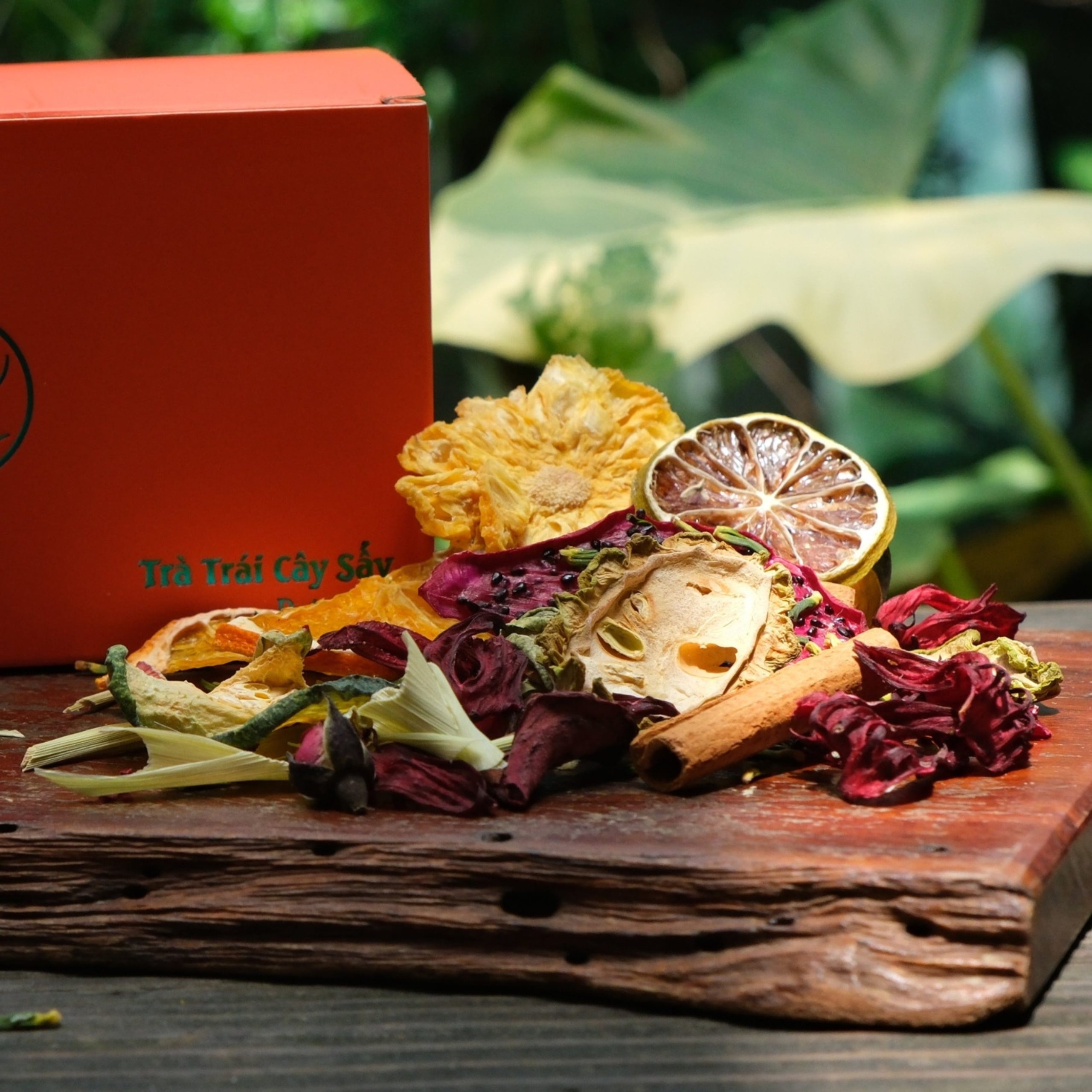 BUBU Premium Dried Fruit Tea is a refined blend of fruits, flowers, and herbs from Vietnam, primarily sourced from Lam Dong, Hue, and Quang Nam, regions renowned for their fresh climate and fertile soil. The special recipe combines orange, pineapple, lime, dragon fruit, hibiscus, Tibetan rose, butterfly pea, ginger, lemongrass, cinnamon, lotus heart… to create a balanced, refreshing, and nourishing flavor. Beyond detoxifying the body, cooling the system, and relieving stress, this tea also supports healthy, glowing skin, bringing freshness and positive energy to your day.