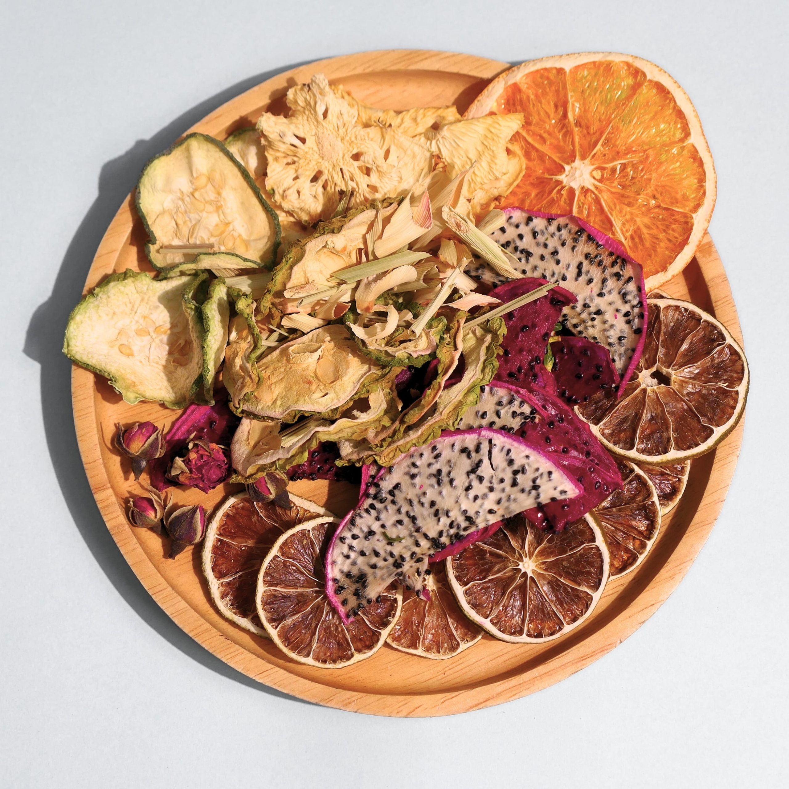 | Ingredients | Orange, pineapple, lime, white & red dragon fruit; hibiscus, Tibetan rose, butterfly pea; ginger, lemongrass, winter melon, bitter melon, beetroot; lotus heart, cinnamon. |