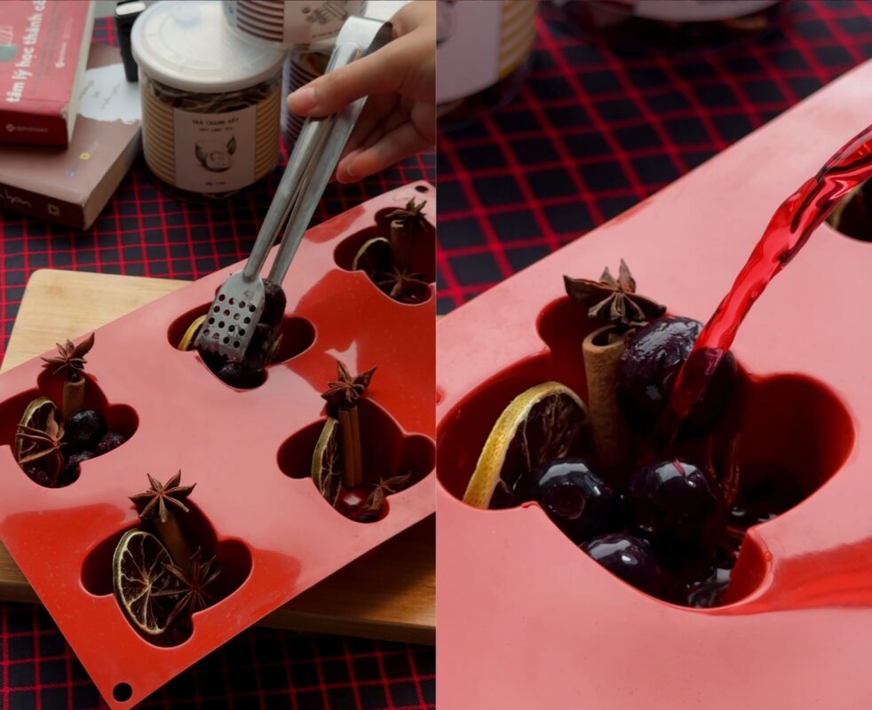 • Bước 3: Từ từ rót phần trà Hibiscus đã pha vào khuôn, đảm bảo các nguyên liệu được ngập đều.